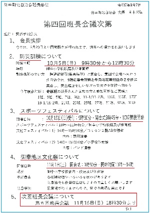 (事業)第3条 この会は前条の目的を達成するために 次の事業を行う。 | 1.会員相互の親睦友好活動の推進 2.自治会内の生活環境の整備を推進 3.自治会住民の文化向上を推進 4.女性の自治会参加と活動の推進 5.青少年の健全育成を推進 6.防犯、防火、交通安全運動の推進 7.自治会新規加入の促進 8.老人会への加入促進と老人福祉の向上 9.自治会の広報活動を推進 10.その他、目的を達成のため必要な事項 |