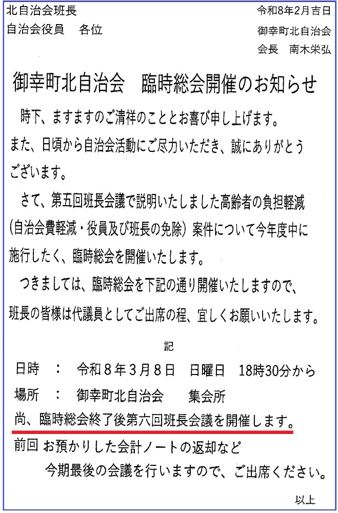 2026年2月18日 会長より【3月8日 臨時総会】の連絡