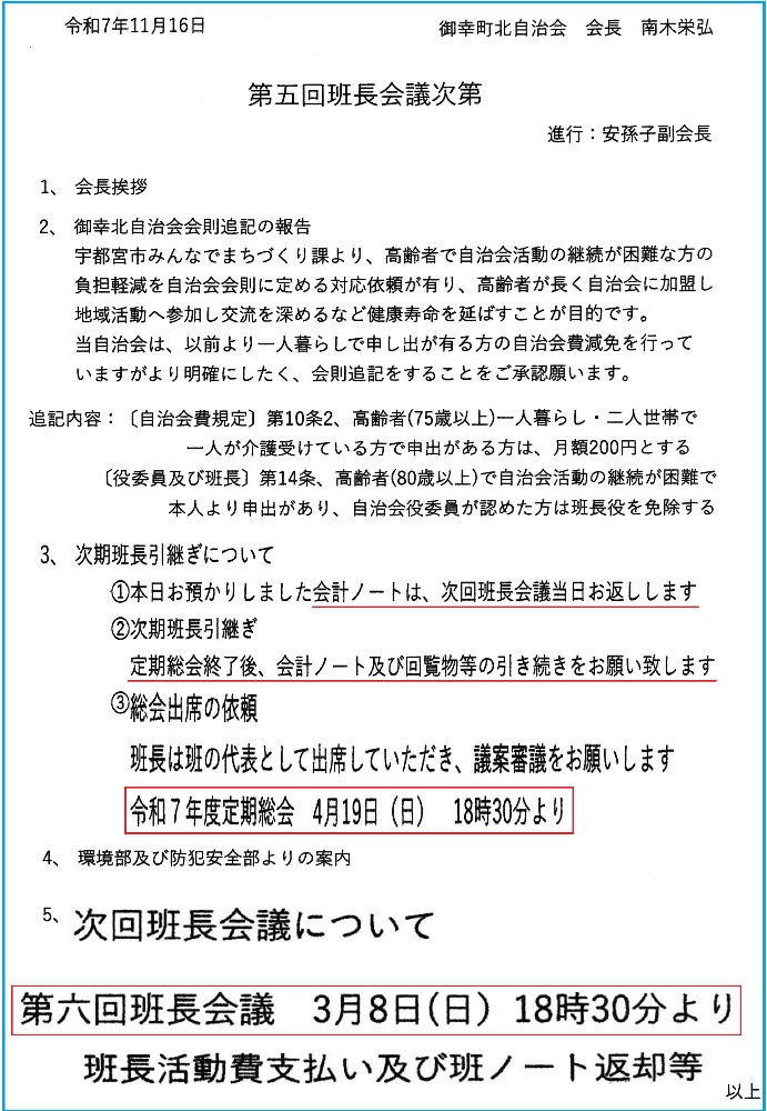 2025年2月12日 会長より第5回班長会議 2月23日開催のお知らせ